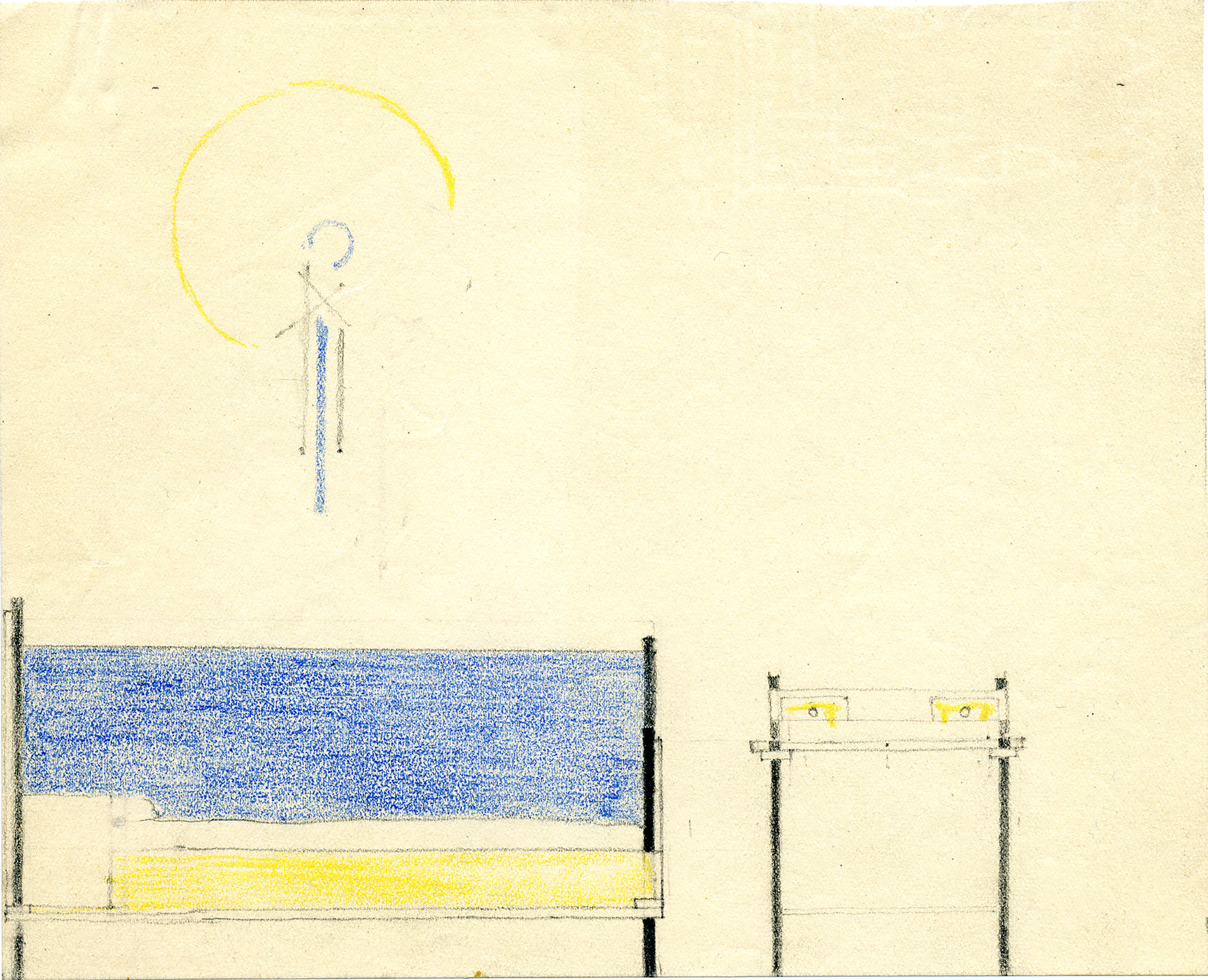 Marie-Laure and Charles de Noailles, then in search of objects for their new home in Hyères, loved his unique creations. The innovative spirit perfectly matched Mallet Stevens’ architecture, which was highly influenced by the work of the Dutch architects and designers. Their commission from Van Ravestijn for the interior design of a guest room on the second floor dates from late 1925. The furniture, made in the Middelbeek workshop in Utrecht, was brought to Marseille by boat in early 1926. Van Ravestijn closely followed the development on site, in close collaboration with architect Léon David, whom he asked to respect the choice of colours, as he considered it a total work of art. The interior was completed with his lamps and an artwork by Piet Mondrian, Tableau II, purchased by the Noailles in Paris in late 1925 on the advice of Sybold van Ravestijn. The bedroom was photographed shortly afterwards, then published by the art critic Christian Zervos in the famous magazine Les arts de la maison.
