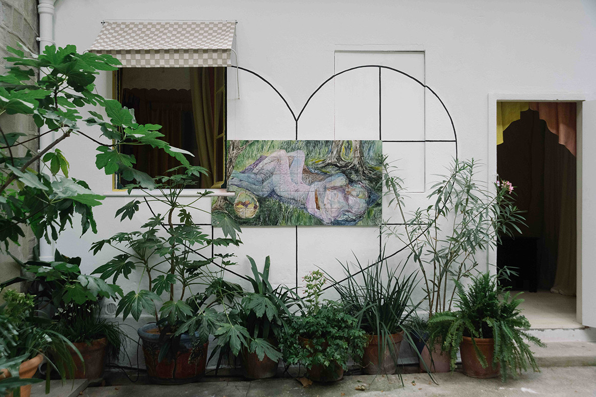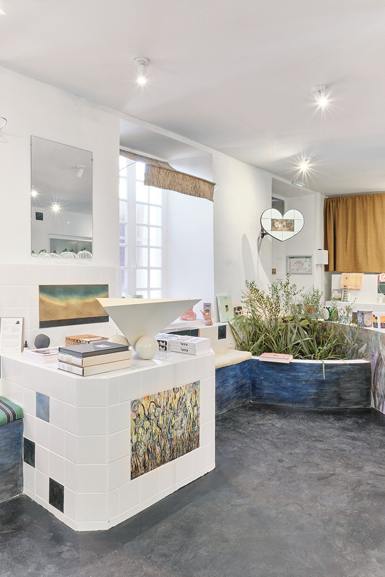 Dans cette version à grande échelle du mobilier en carreaux peints de la cour des pieds carrés de la villa Noailles, Jacent continue d’interroger les relations entre art contemporain et arts décoratifs. L’espace est pensé comme un salon où l’on peut s’asseoir, converser, lire, essayer un vêtement, boire une boisson fraîche… Un lieu qui célèbre la fusion de l’art et de la vie.