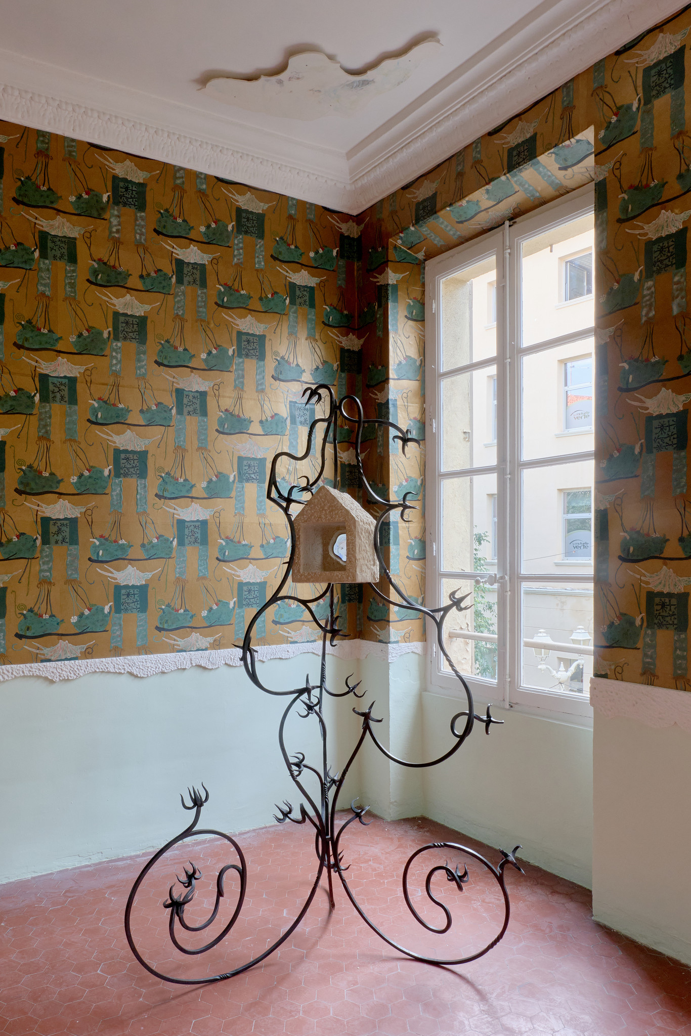 Wunder Haus est l’antre d’un bâtisseur touche-à-tout travaillant à la construction de son monde par l’assemblage d’éléments disparates et de matériaux en tout genre. Maison luxueuse au-tant que cabane chimérique, sa construction se poursuit insatiablement comme un jeu d’enfant. Cette dimension libre et hasardeuse fait de l’architecture le manège de l’imaginaire et un support de fiction. Elle devient la représentation d’elle-même et de nos fantasmes de bâtisseur, pouvant élever et associer sans contrainte les éléments hybrides de nos collectes : objets glanés sur le chemin, images imprimées dans notre mémoire, tout de-vient sujet à construction concrète. Envisagée dans son rapport aux autres arts, Willie Morlon expérimente les matériaux, leur association et leur usage. Suggérée dans une tapisserie, dans une élévation de fer forgé et de pierre ou dans un vitrail, la construction témoigne des métiers d’art qui la composent, et s’étend aux frontières de l’art et de l’architecture.